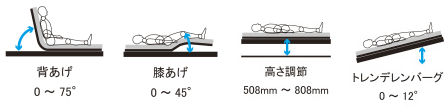 クランクハンドルで、 背・膝の角度やベッドの高さ(またはトレンデレンバーグ)が操作可能 ![]() |